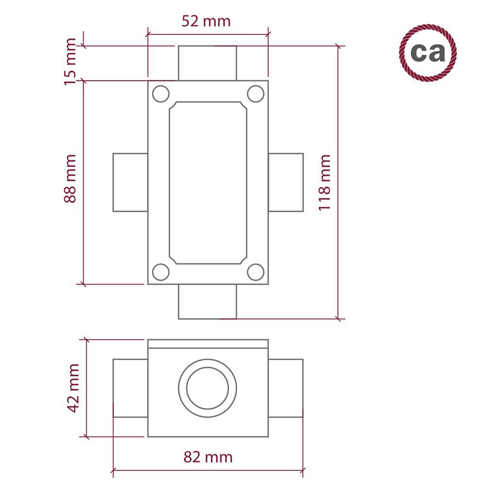 Caja de conexiones en forma de X de cuatro salidas para Creative Tube, caja de aluminio.Caja de conexiones de aluminio en forma de X de cuatro salidas con conector de tierra.Caja: Aluminio fundido a presión UNI EN 1706 (ex UNI 4514) con salidas roscadas Tapa: Placa de aluminio prensado con juntas planas, estanco IP55 Los tornillos de fijación de la tapa y de puesta a tierra son de acero galvanizado Grado de protección: IP55 Rosca ISO: ISO M20x1,5.