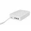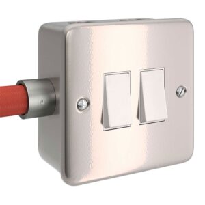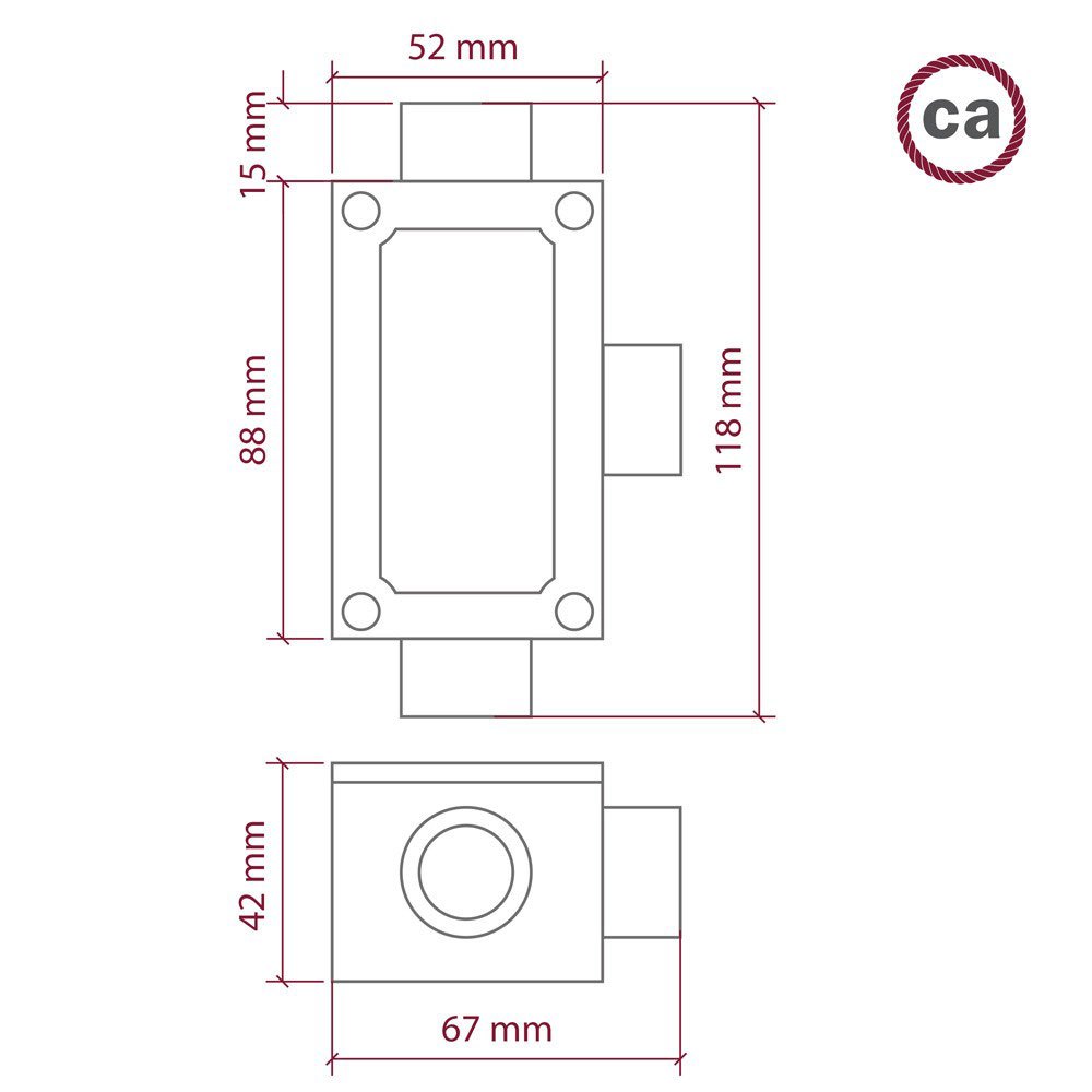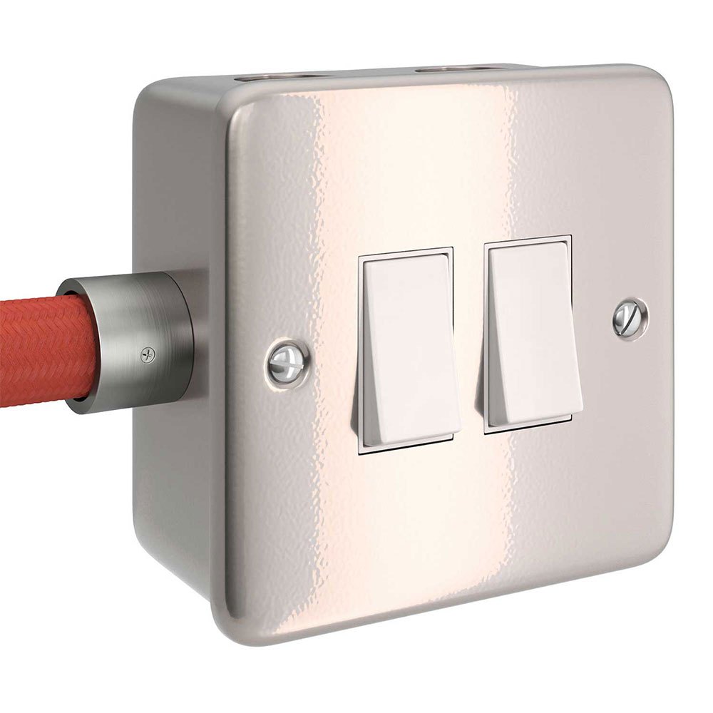 Caja revestida de metal con doble enchufe Schuko para Creative Tube.Especificaciones técnicas: 16 Amp Ancho: 142 mm Alto: 81 mm Fondo: 45 mm Dimensiones externas del enchufe: 11 mm Número de orificios: 8 Material: acero / plástico Gris plateado Compatible con Creative Tubes de 20 mm de diámetro con certificación CE y RoHS.