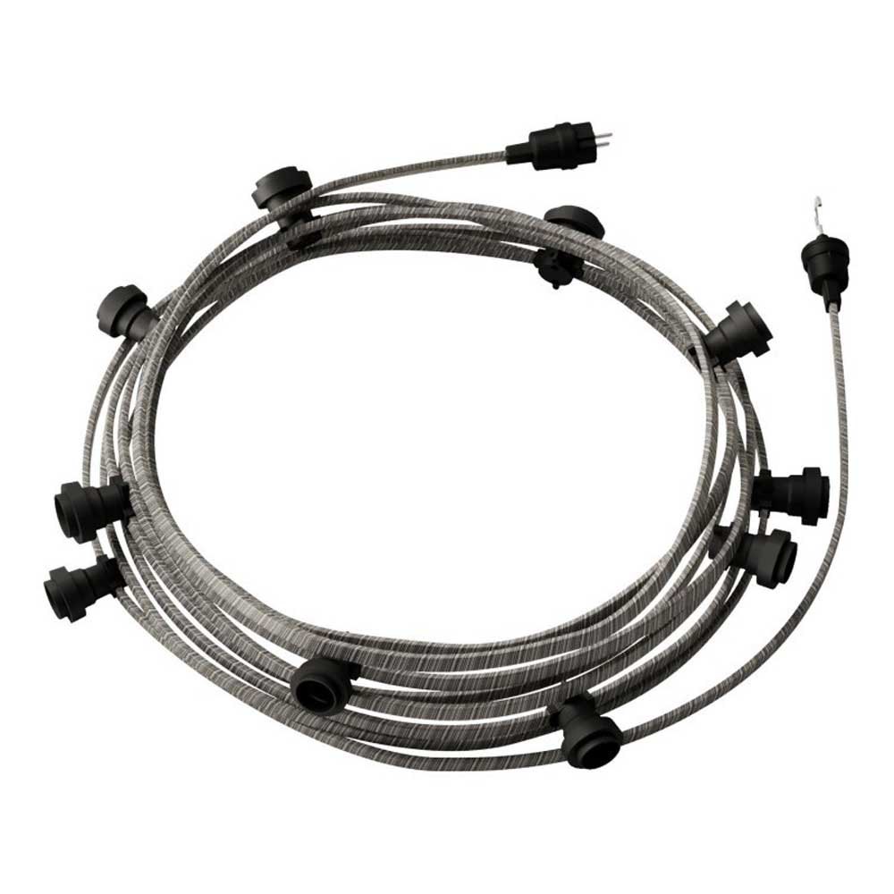 Guirnalda Lumet System lista para usar de 7.5 m con cable textil, 5 portalámparas, gancho y enchufe negro.Color Cable:CZ22.Lumet Guirnalda 7,5 tm:Datos técnicos del cable:Cable 2×1.5 con sección rectangular y forma plana, dimensiones 13.5 x 5.5 mm de acuerdo con EN 60228 / IEC 60228 Clase 5 conductor flexible en cobre rojo electrolítico de acuerdo con EN 60228 / IEC 60228.Tipo de cable:H05RNH2-F cubierto de tela.Tensión nominal:300/500 V.Temperatura de funcionamiento:-40 ° C a + 60 ° C.Retardante de llama:conforme con EN 60332-1-2 / IEC 60332-1.Referencia normativa:EN 50525-2-82 e IEC 60245.Datos técnicos para el portalámparas:Compatible con bombilla LED con casquillo E27.Clase II.2A / 220-240V.Potencia máxima de la bombilla:15W.Grado de protección IP44.Datos técnicos para el gancho:Gancho terminal con grado de protección IP44 en termoplástico negro, ideal para componer independientemente una catenaria Lumet.Datos técnicos para el enchufe:16A / 250V.2 polos.Grado de protección IP44.FR y DE estándar.