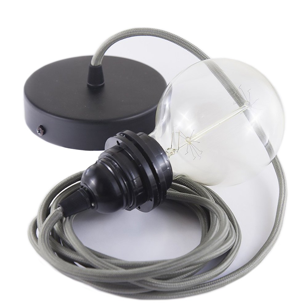 Pendel para pantalla, lámpara de suspensión con cable textil Efecto Seda Gris RM03.Toldo y portalámparas: negro, longitud del cable: 2 metros, montaje: kit de bricolaje, caja de regalo: no.La lámpara colgante consta de:0,5, 1 o 2 metros de cable 2×0,75 o 3×0,75 del color elegido, según portalámparas, 1 rosetón de metal Blanco, Negro, Cromado o Cobre, 2 casquillos portalámparas E27 en baquelita blanco / negro o cromado / cobre metal.
