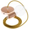 Pendel único, lámpara colgante cable textil Algodón Miel Dorado RC31.Canopy y portalámparas:Cobre, longitud del cable:1 metro, montaje:Kit de bricolaje, caja de regalo:No.La lámpara colgante consta de:0.5, 1 o 2 mt de cable 2×0,75 del color seleccionado, 1 rosetón de metal Blanco, Negro, Cromado o Cobre, 1 portalámparas E27 liso (Max 57W), 1 Copa E27 Blanco, Negro, Cromado o Cobre.