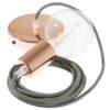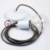 Pendel único, lámpara de suspensión con cable textil Seda Gris RM03.Canopy y portalámparas:Cromo, longitud del cable:2 metros, montaje:Caja de regalo montada:No.La lámpara colgante consta de:0.5, 1 o 2 mt de cable 2×0,75 del color seleccionado, 1 rosetón de metal Blanco, Negro, Cromado o Cobre, 1 portalámparas E27 liso (Max 57W), 1 Copa E27 Blanco, Negro, Cromado o Cobre.