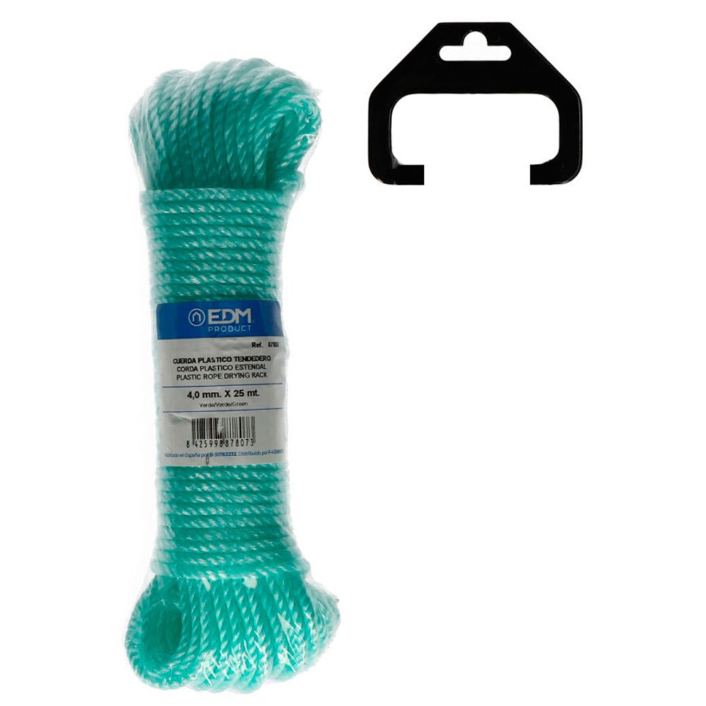 Cuerda plastico 25 mts. composición: monofilamento de polietileno blando, 4 capas. características: suave, buena resistencia, baja elasticidad, absorción de agua 0%. usos: tendederos de interior y exterior, camping, navegación, flejado, agricultura, industria en general, etc.Especificaciones:Peso: 0,2320 kilogramosMaterial: PlásticoMedida: 4,5 mm x 25 mAplicación: Tiendas / Cercas / Industria