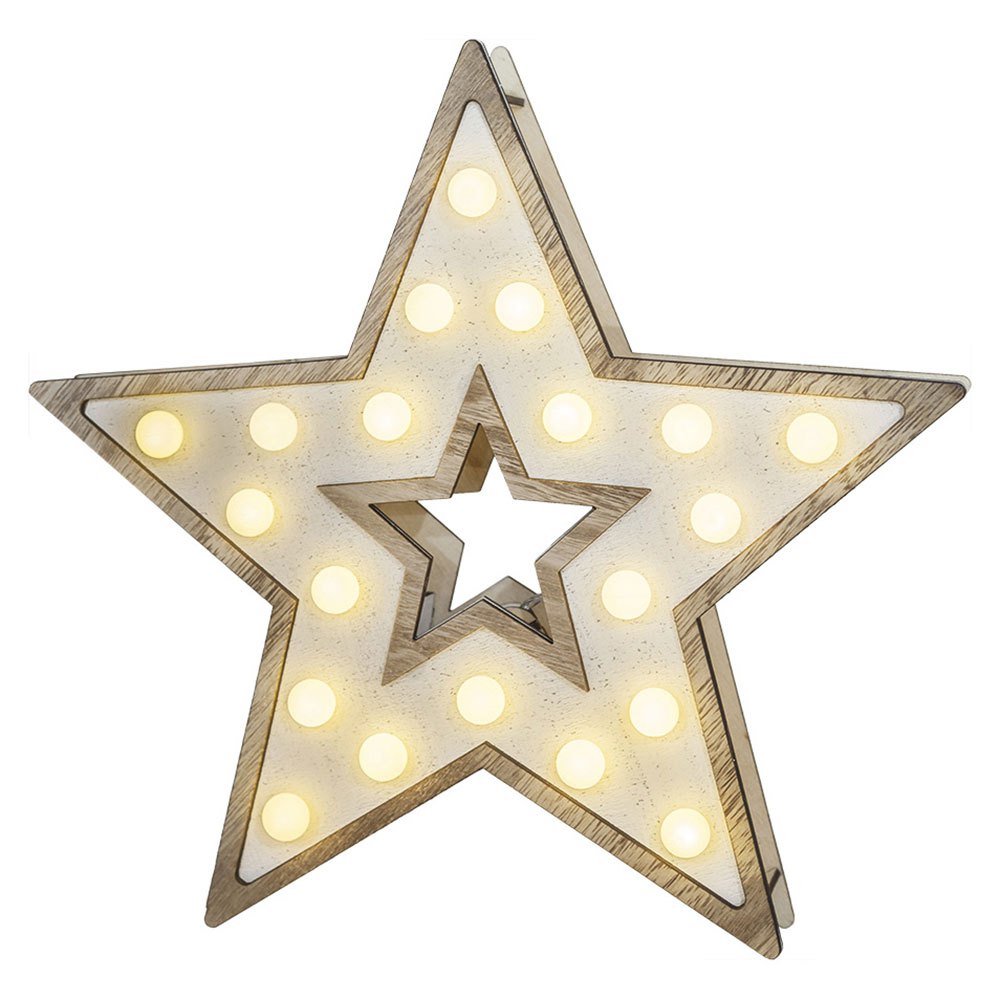 Estrella de madera Nature 25,5 x 27,2cm + 20led 3xaa no incluidoEspecificaciones:Tipo: Figuras iluminablesNúmero de LED: 20Tipo de luz: cálidaMaterial: maderaMedida: 25,5×27,2 cmPeso: 0,2920 KG