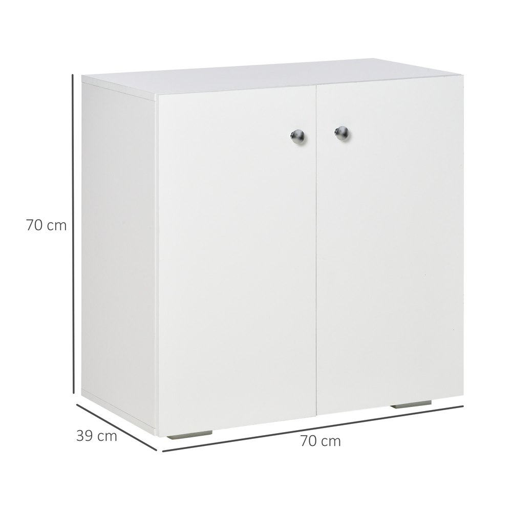 Si necesitas un armario para tener tus objetos siempre organizados, este de HOMCOM es la solución ideal.Fabricado en melamina de madera, es resistente e ideal para un uso prolongado.Tiene una amplia encimera, perfecta para exhibir pequeñas plantas, marcos de fotos, etc.Y tas las 2 puertas se esconden 2 estantes interiores para mantener tus objetos organizados.Las manijas plateadas facilitan la apertura y el cierre de las puertas.¡No lo pienses más y hazte con el tuyo!Características:- Mueble compuesto por una amplia encimera y 2 estantes interiores.- Los pomos plateados de las puertas facilitan su apertura y el cierre.- Hecho de melamina de madera, es u mueble resistente y fácil de limpiar con un paño húmedo.- Tiene un dispositivo antivuelco de seguridad para fijar a la pared.- Pies con almohadillas antideslizantes para mayor estabilidad y evitar que el suelo se raye.- Ideal para el dormitorio, comedor, despacho, salón, etc.- Puede usarse como mueble buffet, librería, organizador de juguetes y más.- Requiere montaje.Especificaciones:- Color:blanco.- Material:melamina de madera.- Medidas totales:70x39x70 cm (LxANxAL).- Medidas interiores del armario:67×35,5×32 cm (LxANxAL).- Altura de las patas:2 cm.- Peso máximo soportado:50 kg (total), 15 kg (cada estante).- Referencia 838-140WT.