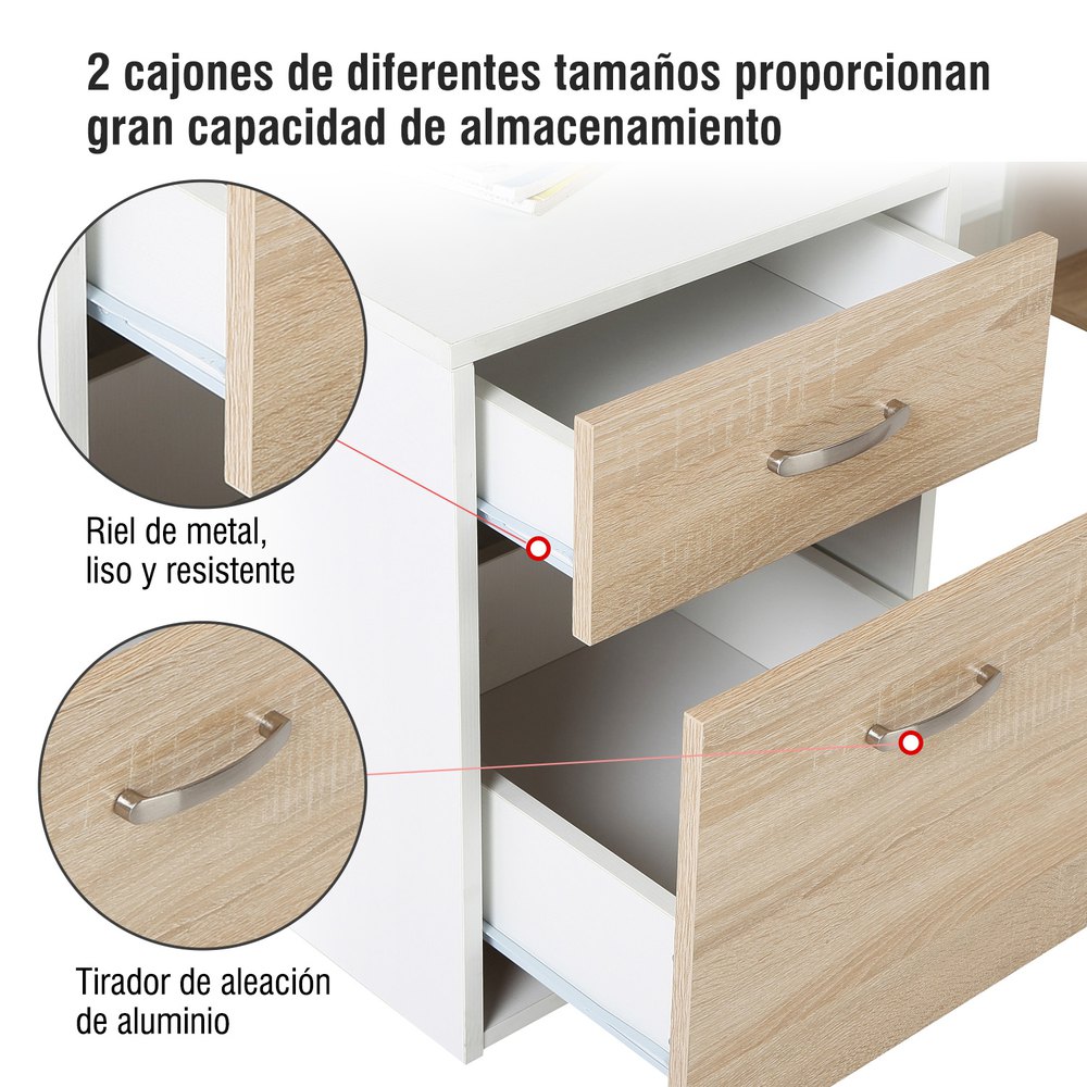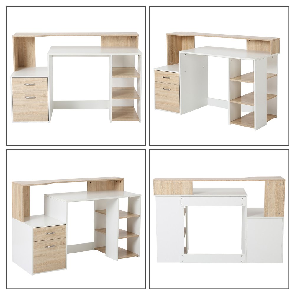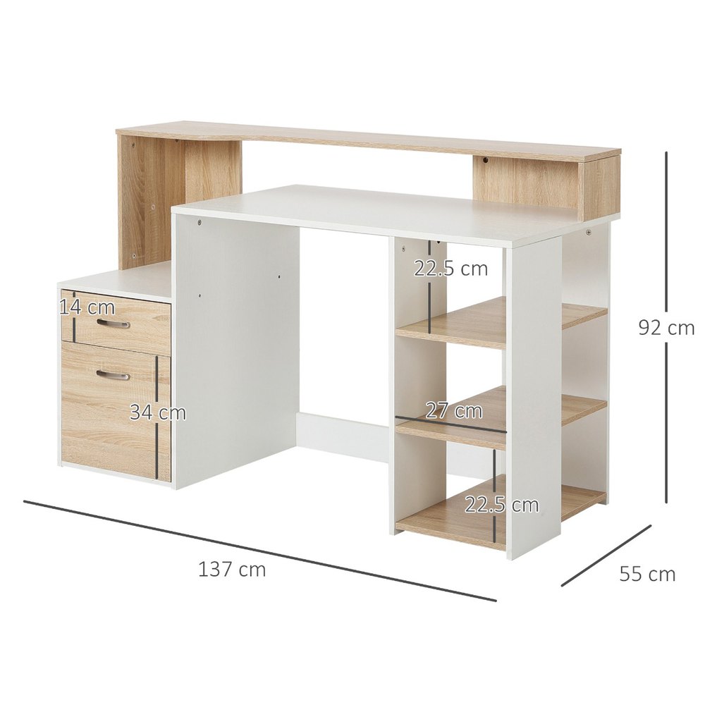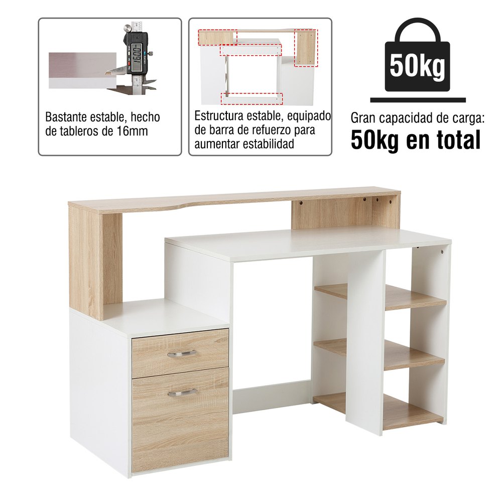 Mesa de escritorio para ordenador PC es ideal colocar en la oficina, despacho, estudio para estudiar o hacer trabajo en casa.Nuestras mesas y escritorios disponen de estanteria de 3 compartimientos, una tabla para colocar productos pequeños, una mesa para colocar ordenar y impresora, dos cajones grandes.Esta mesa de escritorio profesional combina bien con otros muebles y tambien sera ideal como mobiliario de oficina.Características:- Adecuado para espacios de trabajo en oficina y en casa.- Hecho de MDF, la construcción resistente te permite trabajar y almacenar mejor.- Dos cajones, tres estantes, una encimera grande y un estante con respaldo alto.- Cajones deslizantes con rieles metálicos y asas de aluminio para abrir y cerrar fácilmente.- Diseño compacto para adaptarse a habitaciones limitadas.- Requiere montaje.Especificaciones:- Color:roble y blanco.- Material:MDF.- Medidas totales:137x55x92 cm (LxANxAL).- Superficie de la mesa grande:97x55cm (LxAN).- Superficie de la mesa de impresora:39,6×54,5 cm (LxAN).- Superficie de tabero superior:137×30/20 cm (LxAN).- Medidas del cajon pequeño:38×14 cm (LxAN).- Medidas del cajon grande:38×34 cm (LxAN).- Medidas de cada estante:27x51x22,5 cm (LxANxAL).- Carga maxima:50 kg.- Este producto viene con 2 paquetes.