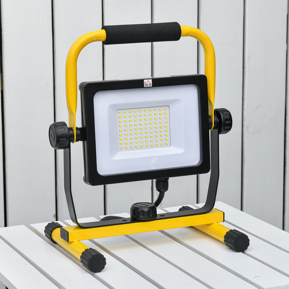 Si alguna vez has estado trabajando en el garaje o taller después del anochecer, sabes lo importante que es una buena iluminación.Este foco de trabajo con luz LED de HOMCOM es ideal para iluminar tu espacio tanto en interiores como exteriores.Su cabezal y base giratorios permiten dirigir la luz hacia donde más la necesites, 360° horizontalmente y 180° longitudinal.Ideal también para llevar de acampada, pesca y más.Características:- Foco de luz LED ideal como punto de iluminación en garaje, taller, reformas, obras, trabajo, almacén, etc.- También es una buena alternativa de luz para llevar de acampada o ir de pesca.- Con perilla ajustable que permite girar la luz horizontalmente hasta 360 grados.- El cabezal de luz también se puede girar longitudinalmente 180° según tus necesidades.- Con 90 cuentas de luz LED que producen 5000-6000 lúmenes de brillo.- Se puede transportar de forma sencilla y cómoda gracias a su mango de fácil agarre.- Grado de protección IP65, apto para usar a la intemperie y resistente al polvo.- Uso sencillo, con práctico interruptor de encendido y apagado.- Soporte con pies de caucho antideslizante para mayor estabilidad.- Fácil de instalar sin necesidades de herramientas.Especificaciones:- Color:amarillo y negro.- Material:metal y aluminio.- Medidas totales:27x19x32 cm (LxANxAL).- Medidas del cabezal:19×14,5 cm (LxAN).- Potencia:50W.- Temperatura de color:5000K.- Brillo:5000-6000 lúmenes.- Voltaje nominal:220V/50Hz.- Grado de protección:IP65.- Certificaciones:CE-EMC, LVD, RoHS y Erp.- Referencia:B41-009.