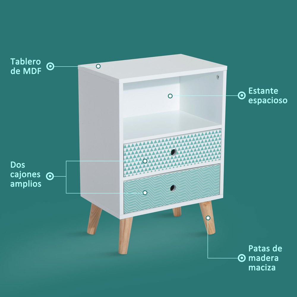 ¿Necesitas una cómoda moderna y original? Esta cajonera es perfecta como mesita de noche, armario bajo u organizador de almacenamiento.Los colores combinan perfectamente con tu hogar.Sirve como armario bajo, mesita de noche u organizador de almacenamiento.Ideal para el dormitorio, el salón, la sala de estudio y la oficina.Hecha con material de madera MDF, con muy buenos acabados.Es muy duradera, estable y fácil de limpiar.Cuenta con 4 patas de madera maciza, robustas y resistentes.El diseño es compacto y elegante, ocupa poco espacio y tiene 2 cajones y 1 estante grande en el que podrás guardar lo que desees.Características:- Cómoda de estilo moderno, muy decorativa y con unos colores que combinan perfectamente con tu hogar.Sirve como armario bajo, mesita de noche u organizador de almacenamiento.Ideal para el dormitorio, el salón, la sala de estudio y la oficina.- Alta calidad:Hecha con material de madera MDF, con muy buenos acabados.Es muy duradera, estable y fácil de limpiar.Cuenta con 4 patas de madera maciza, robustas y resistentes.- Diseño original:El diseño es compacto y elegante, ocupa poco espacio y tiene 2 cajones y 1 estante grande en el que podrás guardar lo que desees.- Viene bien embalada y protegida y es muy fácil de montar.Especificaciones:- Color:Blanco.- Material:MDF.- Dimensiones totales:45x30x65cm(LxANxAL).- Dimensiones interiores de los cajones:39×22.5x6cm(LxANxAL).- Dimensiones del estante:41.7×17.8x20cm(LxANxAL).- Peso bruto:12.5kg.- Peso neto:11.5kg.- Capacidad de carga:20 kg.- Referencia:833-277.
