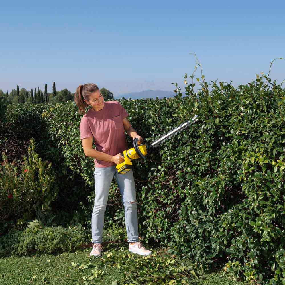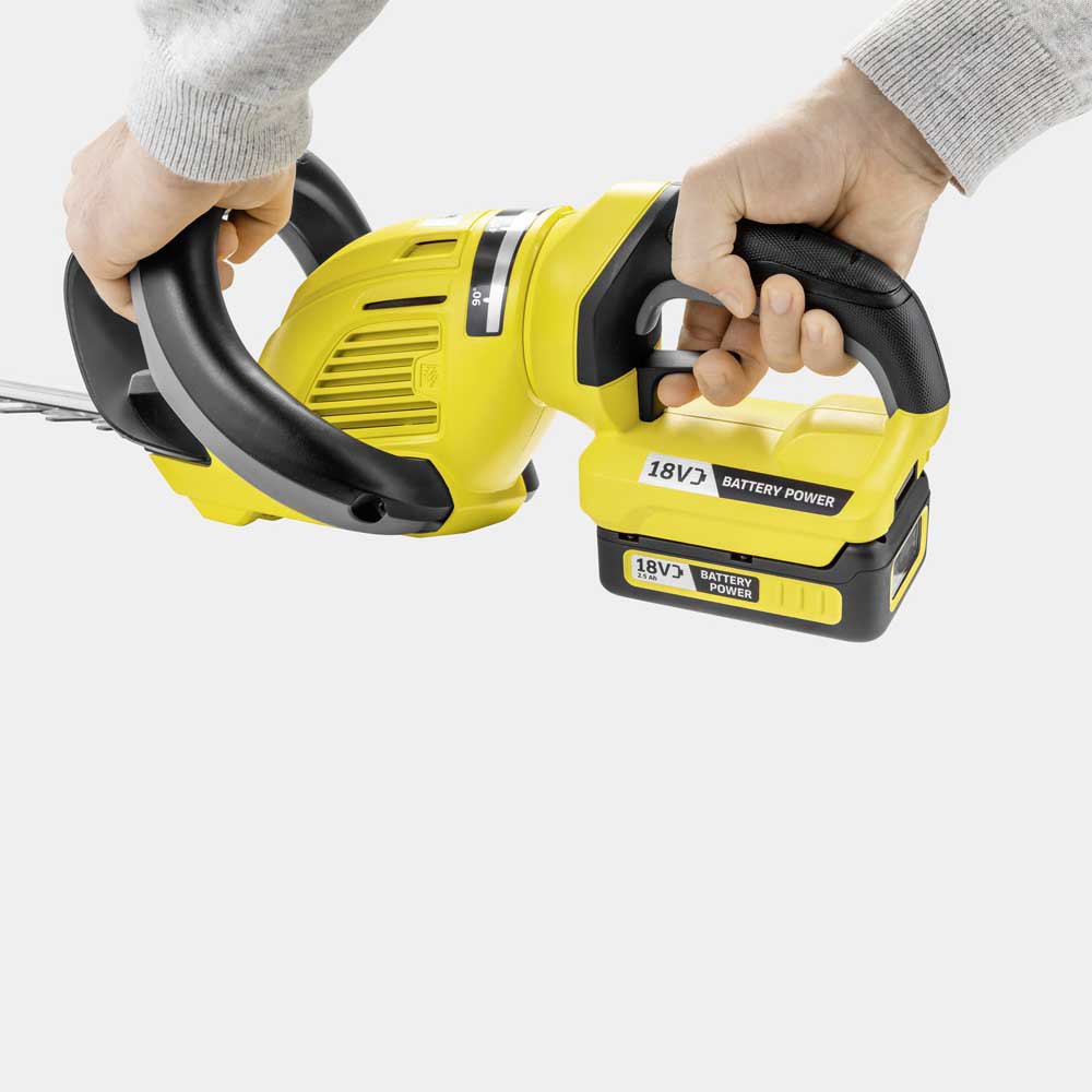Con su mango giratorio de 180° y su práctica barredora de corte, el cortasetos inalámbrico Kärcher Hge 18 50 hace que sea fácil y seguro cortar setos y completar otras tareas de poda en el jardín. Una hoja rectificada con diamante de 50 cm logra un acabado preciso, mientras que un sistema antiatascos evita que la hoja se bloquee. Este Aparato Es Cómodo Para Trabajar Gracias A Su Diseño Ligero Y Mango Giratorio, Que Evita Que Sus Brazos Y Hombros Se Cansen Al Realizar Cortes Verticales. También hay una función de sierra para ayudarlo a abordar ramas más gruesas, mientras que un protector de hoja incorporado lo protege contra los bordes de los edificios. El accesorio de barrido de recortes facilita la limpieza de los recortes en lugar de dejarlos en el arbusto. Para su seguridad, un circuito de seguridad de dos manos evita que el dispositivo se inicie por accidente. Es compatible con las baterías Kärcher 18v 2.5ah o 5.0ah, y cuenta con una pantalla LCD para indicarle cuánta batería le queda mientras recorta los setos.Características:Mango trasero giratorio:El mango se puede girar 180° en varias etapas para proporcionar una posición de trabajo cómoda. Cortasetos Hge 18 50 Batería: Escoba de setosEscoba de cobertura:Barre convenientemente los recortes de setos que normalmente caerían en el seto a lo largo del suelo frente al usuario. Cortasetos Hge 18 50 Batería: función de sierraFunción de sierra:Particularmente Práctico Para Setos Con Ramas Más Gruesas Ocasionales.Hoja de tierra de diamante:La hoja garantiza un resultado de corte preciso.Diseño de mango ergonómico:Para un agarre agradable y seguro también durante largos períodos de trabajo.Guardia de control:Protege la cuchilla y evita daños a edificios y pisos.Con Suspensión Integrada Para Un Práctico Almacenamiento En La Pared.Circuito de seguridad de 2 manos:Contra el arranque involuntario del cortasetos.Plataforma de batería Kärcher Battery Power de 18 V:Tecnología en tiempo real con pantalla LCD de batería: tiempo de funcionamiento restante, tiempo de carga restante y capacidad de la batería.Larga duración y potente gracias a las células de iones de litioLa batería intercambiable se puede utilizar en todos los demás dispositivos de plataforma de energía de batería Kärcher de 18 V.Especificaciones:Plataforma de batería: Plataforma de batería de 18 VLongitud de corte (cm): 50Espacio entre dientes (Mm): 22Regulación de velocidad: SíVelocidad de la hoja: 2700Tipo de hoja de corte: perforada, rectificada con diamanteVoltaje (V): 18Rendimiento por carga de batería * (M): Máx. 325 (2,5 Ah) / Máx. 650 (5,0 Ah)Tiempo de ejecución por carga de batería (Min): Máx. 40 (2,5 Ah) / Máx. 80 (5,0 Ah)Peso Sin Accesorios (Kg): 2,9Peso incluido Embalaje (Kg): 4,6Dimensiones (largo x ancho x alto) (mm): 970 X 213 X 188Equipo:Variante, batería y cargador no incluidosMango, GiratorioFunción de sierraGuardia de controlProtector de la hojaBucle de almacenamiento colganteEscoba de cobertura