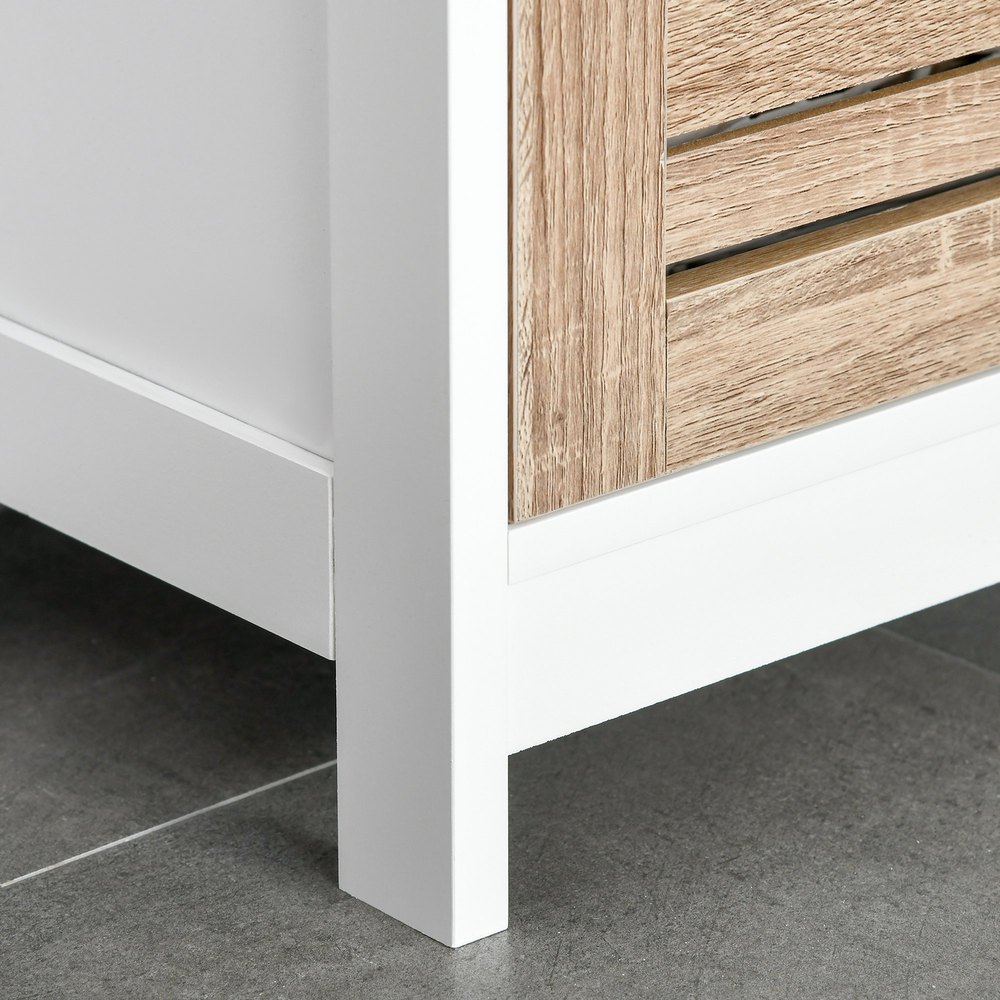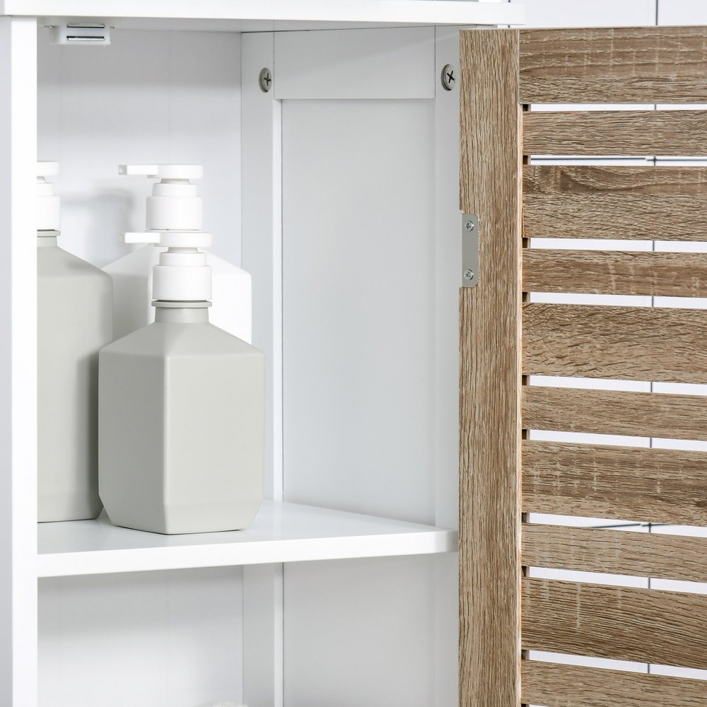 Este mueble de baño estrecho de kleankin complementa a la perfección varios espacios y estilos de tu hogar. El diseño de 3 estantes abiertos y 1 armario ofrece un amplio espacio de almacenamiento para que puedas mantener todo organizado. Dispone de baldas regulables para adaptarse al tamaño de tus productos. Además, gracias a su bonito diseño y combinación de colores en blanco y roble, su uso no se limita al baño, sino que también quedará genial en la cocina, el dormitorio y más. Características – Armario compacto para adaptarse a espacios pequeños – Adecuado para el baño, sala de estar, dormitorio, pasillo o cocina – Puerta con diseño de listones que dará un toque de elegancia a donde la coloques – Fabricado con resistente tablero MDF, ideal para uso prolongado – Cuenta con 1 armario cerrado con 3 estantes y 3 estantes abiertos para cubrir diversas necesidades de almacenamiento – Estantes regulables en altura a diferentes niveles para adaptarse a diferentes necesidades – Superficie fácil de limpiar – Con sistema antivuelco para fijar a la pared para mayor seguridad y estabilidad – Requiere montaje Especificaciones – Color: blanco y natural – Material: MDF – Medidas totales: 34x30x172 cm (LxANxAL) – Medidas del estante abierto: 28x24x73 cm (LxANxAL) – Altura del nivel medio (de arriba a abajo): 24/23/23 cm – Altura de cada nivel ajustable: 3,2 cm – Medidas interiores del armario: 28×22,5×88 cm (LxANxAL) – Medidas del estante superior: 28×22,5×29 cm (LxANxAL) – Altura del nivel medio: 29 cm – Altura de cada nivel ajustable: 3,4 cm – Altura de las patas: 4 cm – Carga máxima: 30 kg (total) y 5 kg (estante) – Referencia: 834-349
