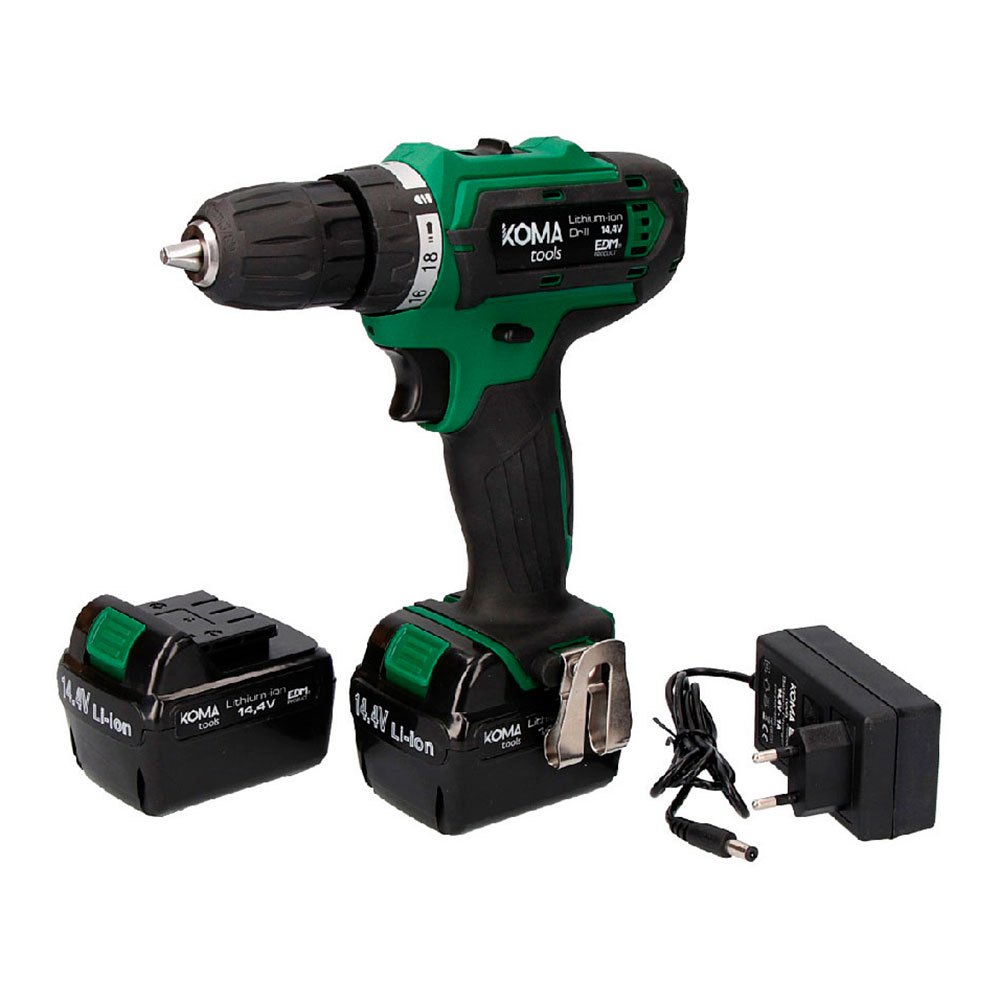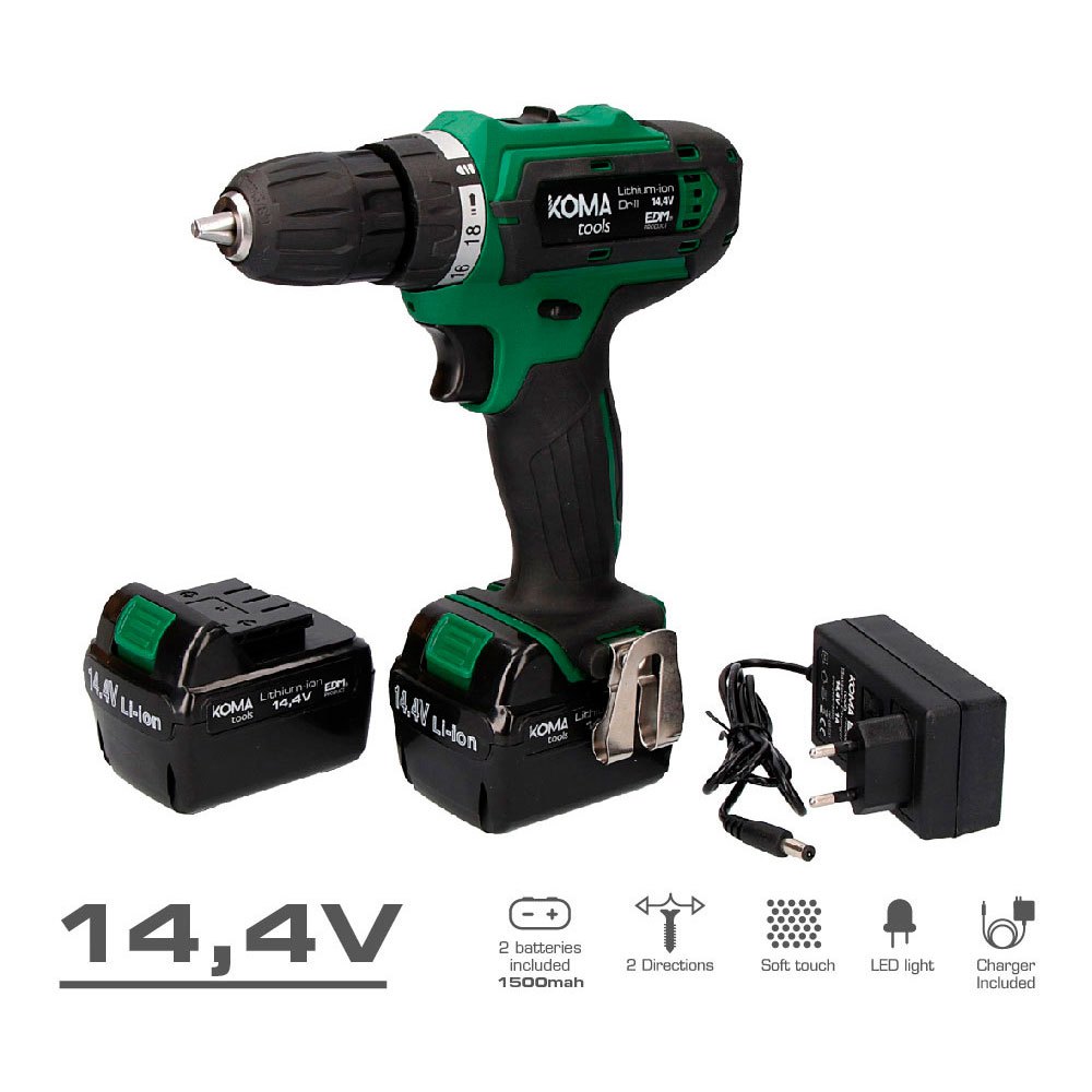 SOF Taladro inalámbrico de iones de litio. potencia: 14.4v. 2 baterias bmc box 1500ma 0 700rpm 18nm. izquierda/derecha/rotación. Mango ergonómico de tacto suave. les par light para iluminar el lugar de trabajo. accesorios: maleta de transporte, 1 punta de destornillador reversible (philips/plana), 2 baterías de ion litio 14,4v y 1500ma, cargador, soporte para colgar en el cinturón. dimensiones: 20x24cm (profundidad/altura) herramientas komaEspecificaciones:Unidades por caja: 1Peso: 2,21 kgMedida: 20x24cmVelocidad (rpm): 700Batería: 1500mahMandril: ø10mmTiempo de carga: 60minCargador: IncluidoMandril: AutomáticoMaleta de transporte: SiTipo: Taladro/controladorPotencia (w): AjustableVoltaje (v): 14,4vRotación: Izquierda/DerechaLuz LED para iluminar el punto de trabajo: SiBatería: 2×14.4v 1500mah incluidaAccesorios: Soporte para colgar el cinturón incluidoAccesorios: 1 punta de destornillador reversible (plano philips