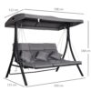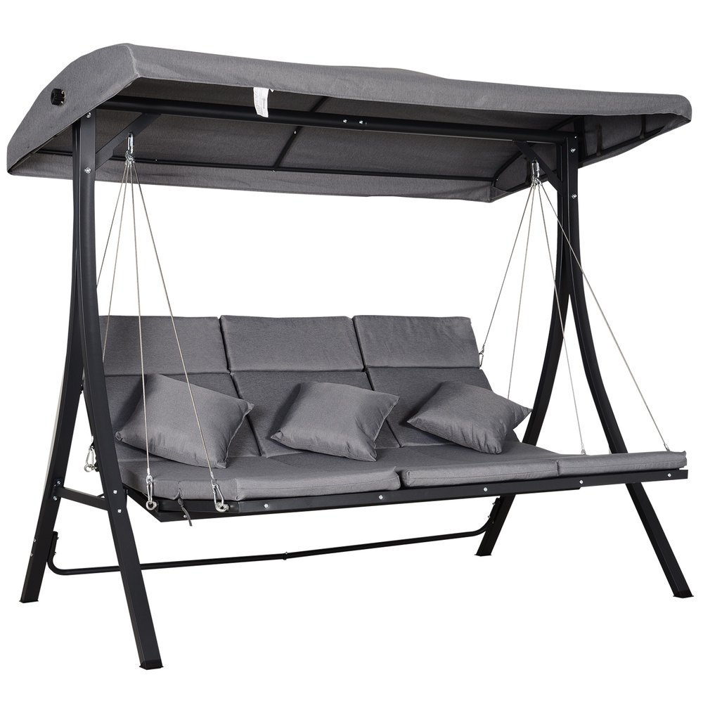 ¿Necesitas darle un toque de comodidad y elegancia a tu jardín o terraza? Este columpio balancín de 3 plazas dispone de toldo y es ideal para decorar cualquier espacio exterior. Ofrece 3 asientos amplios y cómodos para poder disfrutar del tiempo libre con la familia y cuenta con bandejas laterales para colocar bebidas o tu libro de lectura. En la parte superior dispone de un toldo para proteger del sol. ¡Este balancín es un elemento indispensable poder disfrutar del buen tiempo! Características – Balancín de exterior reclinable, ideal para el jardín, la terraza, patio, etc. – Espacioso asiento para hasta 3 personas – Patas con almohadillas antideslizantes para mayor adherencia y estabilidad – El cojín con acolchado de algodón ofrece una gran comodidad para que puedas sentarte a descansar y relajarte – Tiene una bandeja lateral en ambos lados para colocar las bebidas – Toldo de tela de poliéster resistente a la intemperie, al agua y a los rayos UV – Estructura de acero robusta con capacidad de carga de hasta 360 kg – Requiere montaje Especificaciones – Color: gris – Material: metal y poliéster – Medidas totales: 206x116x183 cm (LxANxAL) – Medidas de cada cojín de asiento: 116×51,5 cm – Profundidad de asiento: 55 cm – Grosor del cojín: 8 cm – Medidas de los cojines reposabrazos: Ø18×51,5 cm – Medidas del toldo: 201×118 cm (LxAN) – Carga máxima: 360 kg – Referencia: 84A-068LG