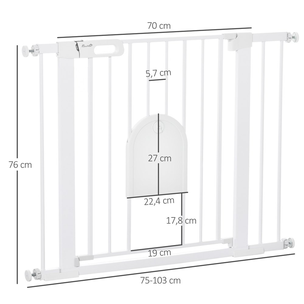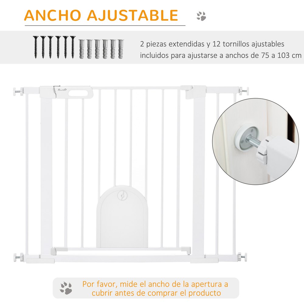Si tienes mascotas en casa y quieres limitar el espacio o protegerlas de las escaleras, esta barrera para mascotas PawHut es ideal.Tiene una puerta con cerradura con sistema de cierre automático y una pequeña puerta para facilitar el paso de las mascotas de un lado al otro.Hecha de metal, tiene 4 tornillos de ajuste y 2 partes extensoras, para ajustarse a espacios entre 75 y 103 cm de ancho ¡Es ideal para familias con mascotas!Características:- Fácil acceso mediante pestillo de apertura en la parte superior, que se puede abrir con una sola mano.- Cuando el ángulo de apertura de la puerta sea inferior a 90°, se cerrará automáticamente al soltarla.- Estructura de acero para mayor resistencia y durabilidad.- Cierre inteligente para mayor comodidad.- Tiene 2 cerraduras en la parte inferior para determinar la dirección de apertura de la puerta.- Tiene una pequeña puerta para facilitar el acceso de tu mascota a través de ella.- Adaptable a diferentes anchos mediante tornillos de ajuste y extensión.- Ideal para hogar con mascotas y apto para puertas, pasillos, escaleras, etc.- Requiere montaje.- NOTA:Esta barrera de seguridad solo es adecuada para aberturas de 75-103 cm, por favor, verificar las medidas antes de comprar este producto.Especificaciones:- Color:blanco.- Material:acero y ABS.- Medidas totales sin extensión:70-82×76 cm (LxAL).- Medidas totales con extensión:82-103×76 cm (LxAL).- Ancho de entrada:60 cm.- Medidas de la entrada pequeña:19×17,8 cm (LxAL).- Distancia entre barrotes:5,7 cm.- Referencia:D06-110V01WT.