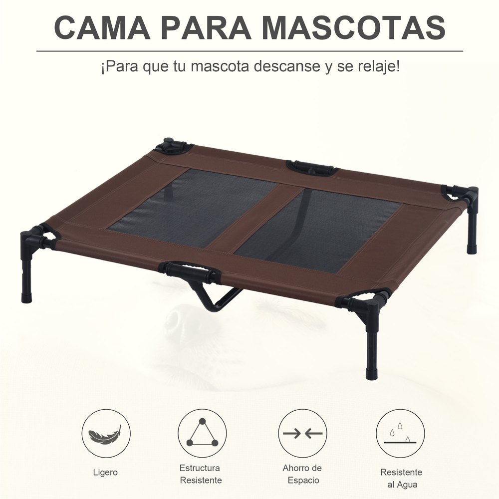 Dormir en una cama elevada y no en el suelo, puede evitar que tu mascota sufra dolor de articulaciones que pueden derivar en artritis.Además, ofrece una mejor transpiración y protege de la humedad.Esta cama elevada de PawHut es ideal para que tu perro pueda descansar evitando la dureza del suelo y se puede usar tanto en interiores como exteriores.Con estructura de metal resistente y tela Oxford transpirable, es muy fácil de montar y desmontar.Características:- Cama mascotas con base elevada que evita la dureza del suelo, ofrece mejor ventilación y protege de la humedad.- Estructura de metal resistente para un uso prolongado a largo plazo.- Con patas de soporte central para proporcionar un mejor apoyo.- Tejido de poliéster transpirable de alta densidad para mantener tu mascota fresca, resistente a la humedad.- Fácil de limpiar y con bajo mantenimiento.- Pies con almohadillas antideslizantes para proteger el suelo y mantener la cama estable.- Apto para perros con peso inferior a 31,8 kg de peso (se recomienda tener en cuenta el tamaño de tu mascota).- Requiere montaje.Especificaciones:- Color:marrón y negro.- Material:tela Oxford y metal.- Medidas totales:91,5×76,2×18 cm (LxANxAL).- Medidas de la malla:34,5×55 cm (LxAN).- Peso máximo soportado:31,8 kg.- Referencia:D04-033.