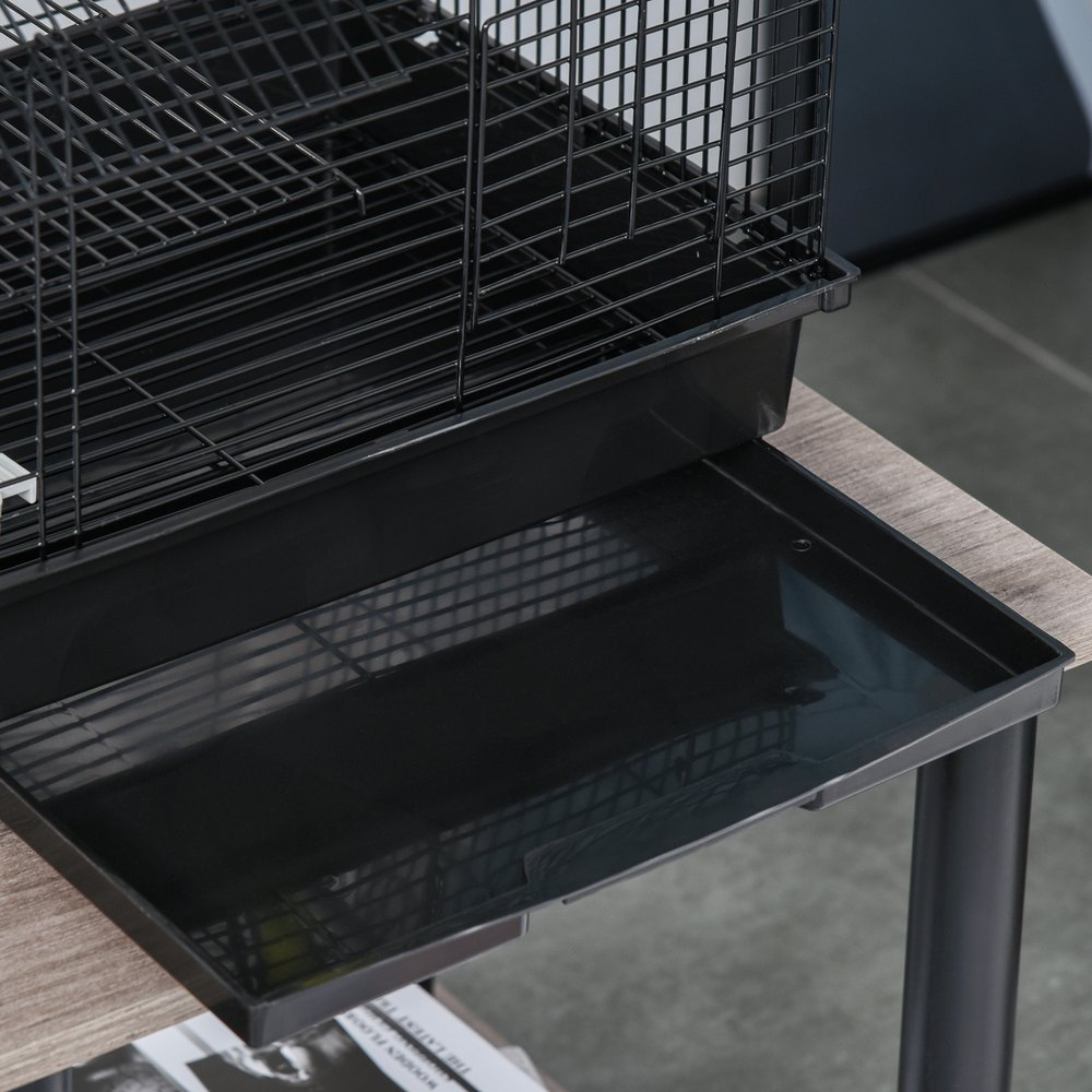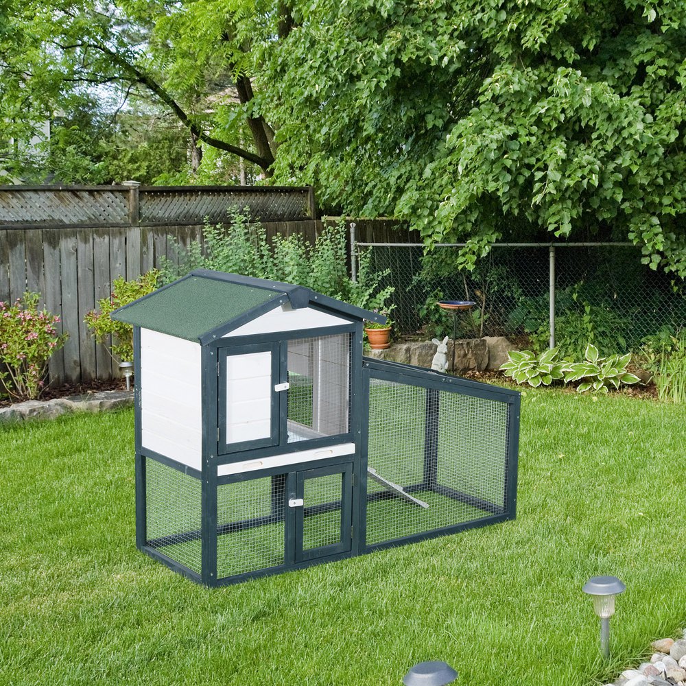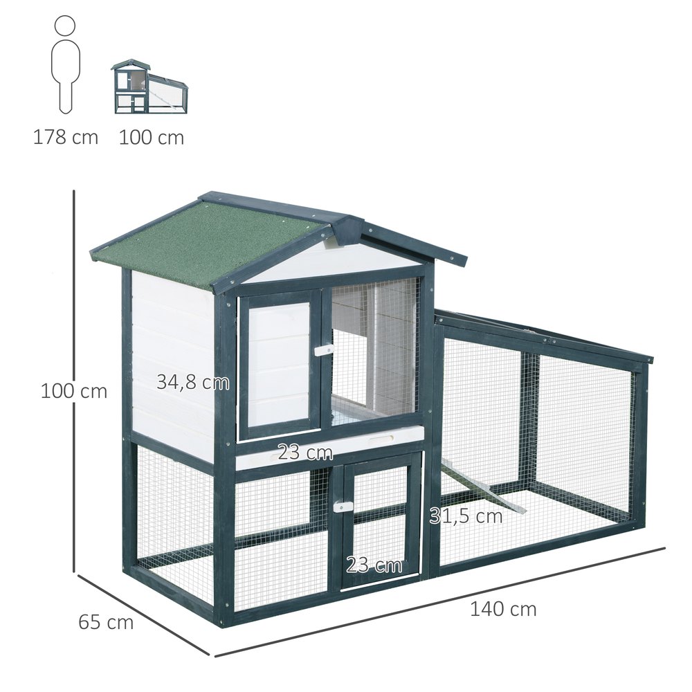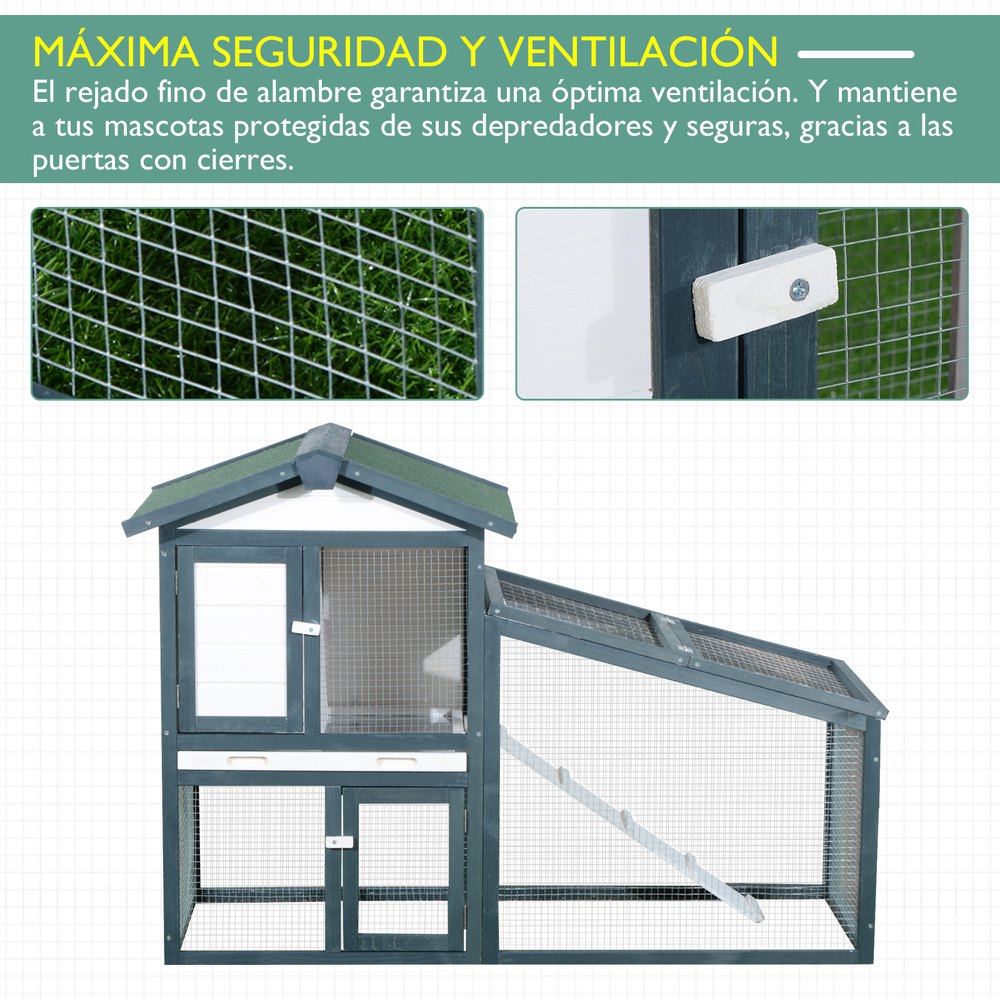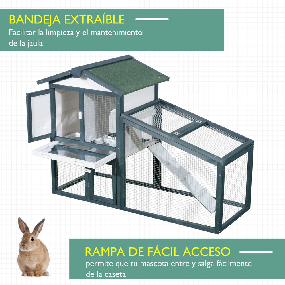 Si buscas una conejera cómoda y resistente para tus amigos peluditos, PawHut te ofrece esta jaula de 2 pisos que seguro que te encantará.Compuesta por un compartimento cerrado y espacio abierto, donde podrán correr libremente a la vez que estarán protegidos de los ataques de sus depredadores.Hecha de metal y madera, cuenta con techo asfáltico para mayor resistencia a la intemperie y una bandeja extraíble para facilitar su limpieza.Características:- Hecha de metal y madera de abeto construida en 2 niveles unidos mediante una rampa.- Con cierre de seguridad para mayor protección.- Techo asfáltico resistente a la intemperie y a los rayos UV.- La caseta elevada del suelo, asegura un espacio seco y cálido protegido de la humedad.- Rampa antideslizante para que pueda moverse rápidamente del interior al exterior.- El espacio abierto, protegido con malla de alambre, ofrece una gran ventilación y mantiene a tus mascotas protegidas de sus depredadores.- Ideal para conejitos, cobayas, chinchillas y otros animales del tamaño similar.- Apto para 2-4 animales, se recomienda comprobar antes de la compra la compatibilidad y cantidad de animales según raza y tamaño.- Se requiere montaje con todos los accesorios incluidos.Especificaciones:- Color:madera natural y gris oscuro.- Material:madera de abeto y metal.- Medidas totales:89,5x45x81 cm (LxANxAL).- Medidas del piso superior:77×35,7×36 cm (LxANxAL).- Medidas del piso inferior:77×35,7×37 cm (LxANxAL).- Medidas de la puerta de madera:27,5×34 cm (LxAL).- Medidas de la puerta de metal superior:44×34 cm (LxAL).- Medidas de la puerta de metal inferior:31×19 cm (LxAL).- Medidas de la rampa:62,5×14,5 cm (LxAN).