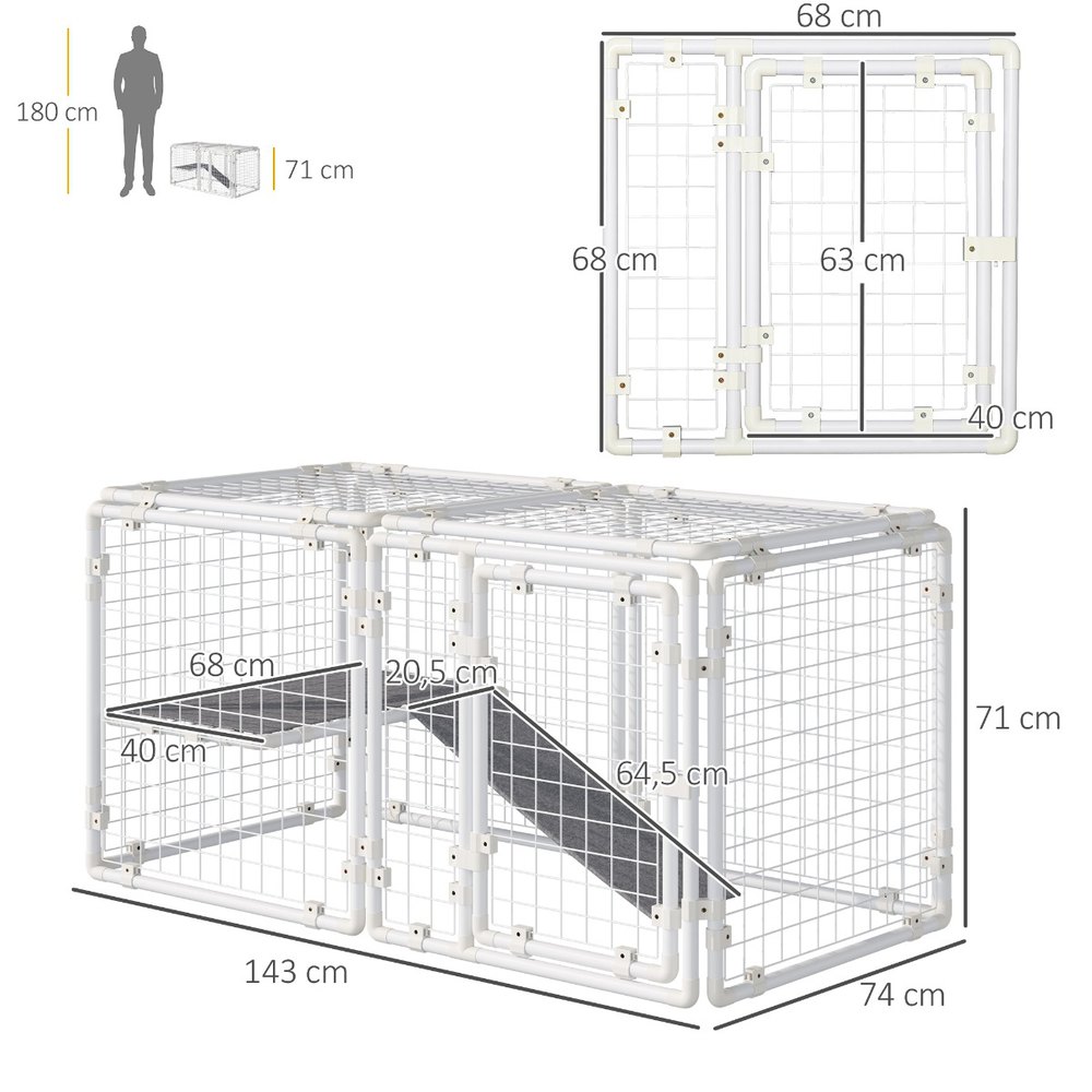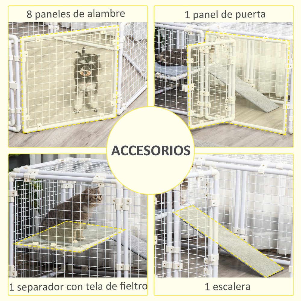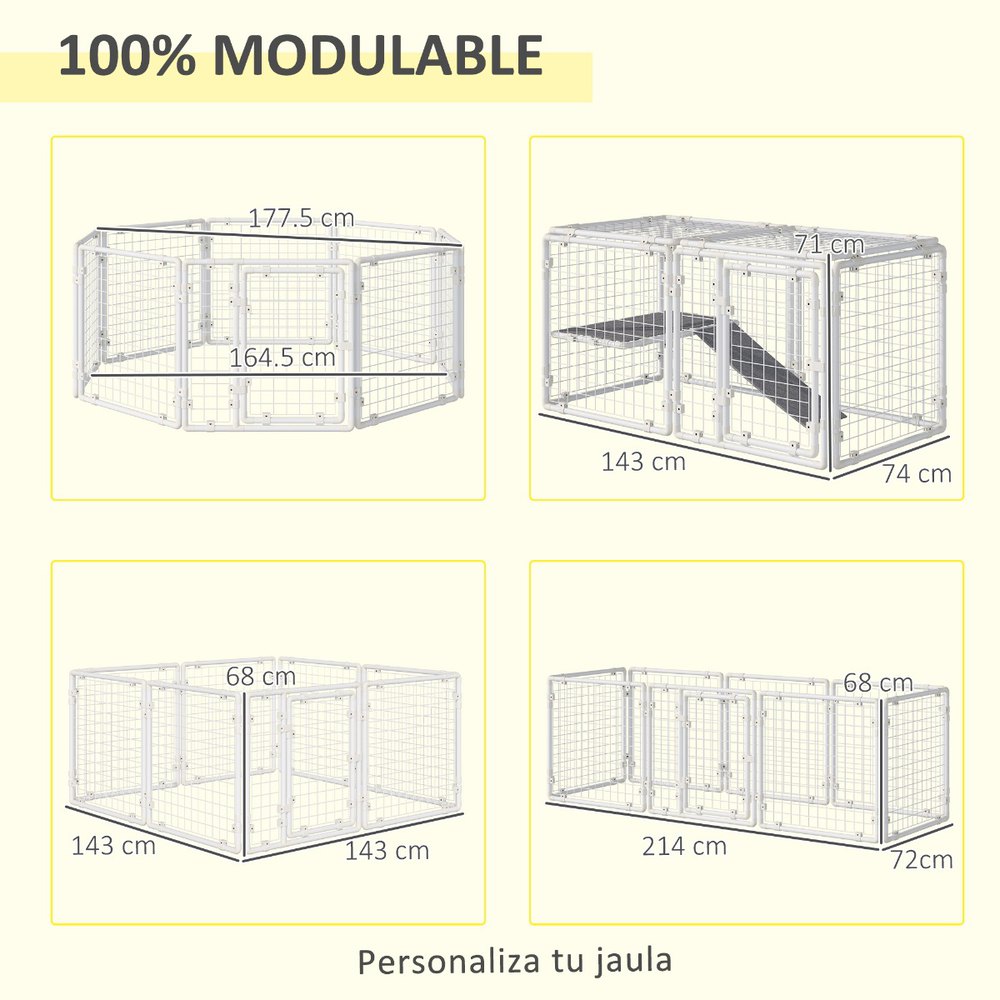 Este recinto para mascotas pequeñas de PawHut es una solución práctica para mantener seguras a tus mascotas pequeñas. Cómodo y versátil, puedes montar los paneles con la forma que prefieras, para adaptarse al espacio que tengas disponible y a tus necesidades. Tiene 1 alfombrilla revestida de fieltro que pueden ser utilizadas como cama o zona de descanso y 1 rampa que conectan los espacios. Recomendado para conejos, cobayas, perros pequeños o gatos. Características – Jaula compuesta por 9 paneles de malla metálica, 1 de los cuales es una puerta, 1 panele divisorio y 1 rampa – Este recinto para animales es completamente modular, por lo que puedes montarlo de diferentes formas – Su diseño de rejilla abierta ofrece una gran visibilidad y te permite interactuar con tus animales desde todos los lados – Un espacio ideal para pequeños animales como conejos, cobayas, pequeños gatos o perros, etc. – Estructura de acero y conectores en PE resistente, ideal para uso prolongado – Requiere montaje Especificaciones – Color: blanco – Material: acero, PE y fieltro – Medidas de cada panel: 68x68x2,5 cm (LxANxAL) – Dimensiones de la partición: 68×40 cm (LxAN) – Medidas de las rampas: 64,5×20,5 cm (LxAN) – Medidas de la puerta: 40×63 cm (LxAN) – Referencia: D51-322