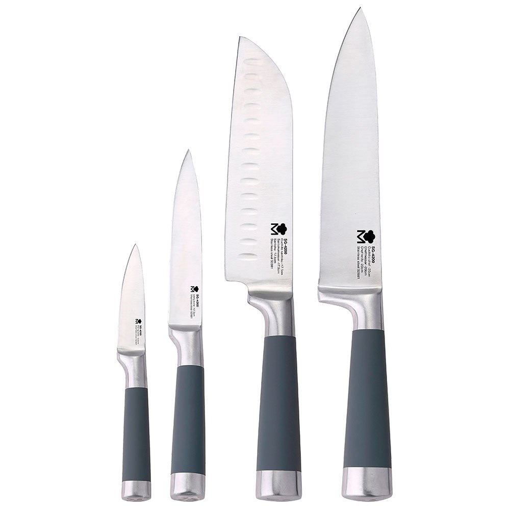 – JUEGO DE LOS CUCHILLOS MÁS UTILIZADOS EN LAS COCINAS PROFESIONALES.- MUY AFILADOS.- FABRICADOS EN ACERO INOXIDABLE 18/10.- MANGOS CON AGARRE SUAVE Y SILICONA PARA FACILITAR SU USO.- SE COMPONE DE:- 1 CUCHILLO CHEF DE 20 cm.s.- 1 CUCHILLO SANTOKU DE 17,5 cm.s.- 1 CUCHILLO MULTIUSOS DE 12,5 cm.s.- 1 CUCHILLO PELADOR DE 9 cm.S.