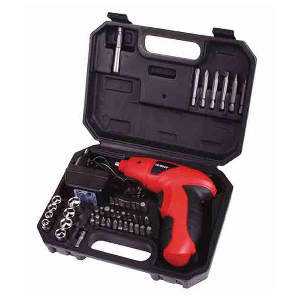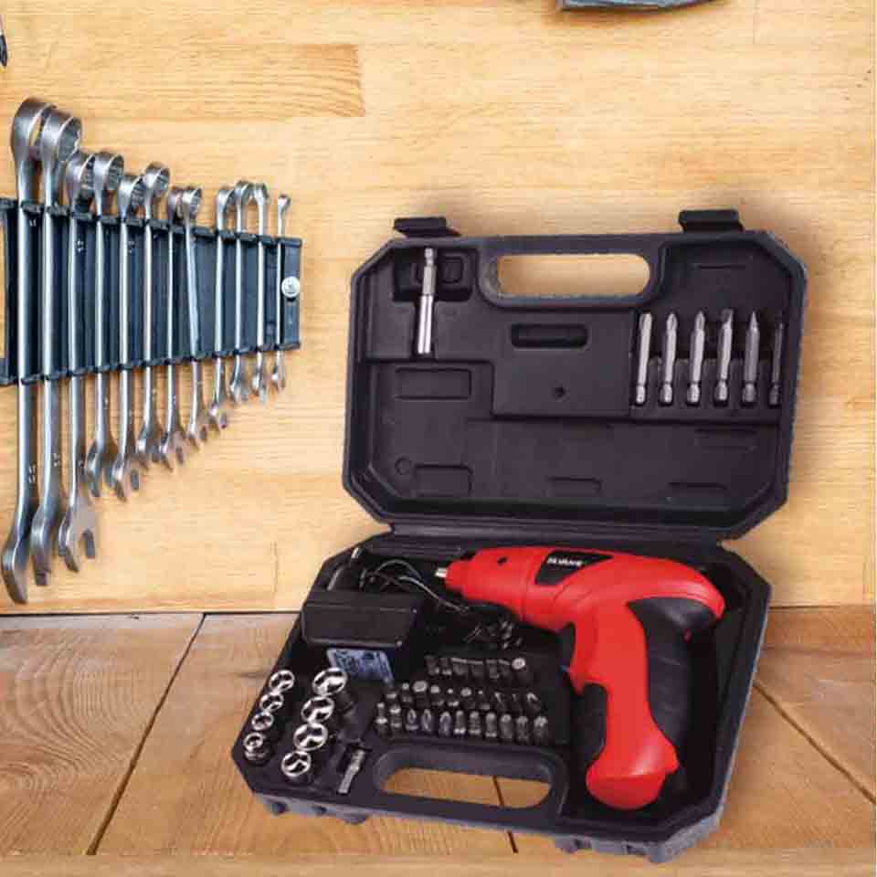Destornillador eléctrico inlámbrico con 44 puntas intercambiables.Taladro atornillador sin cable 4.8V.Bloqueo del eje automático.Con 44 puntas de destornillador.Max Troca:3N.M.Cargador de 3-5 horas de duración.Velocidad sin carga:200 RPM.Adaptador de corriente AC/DC.