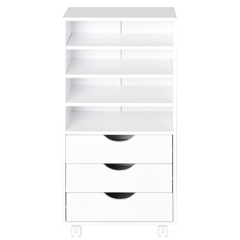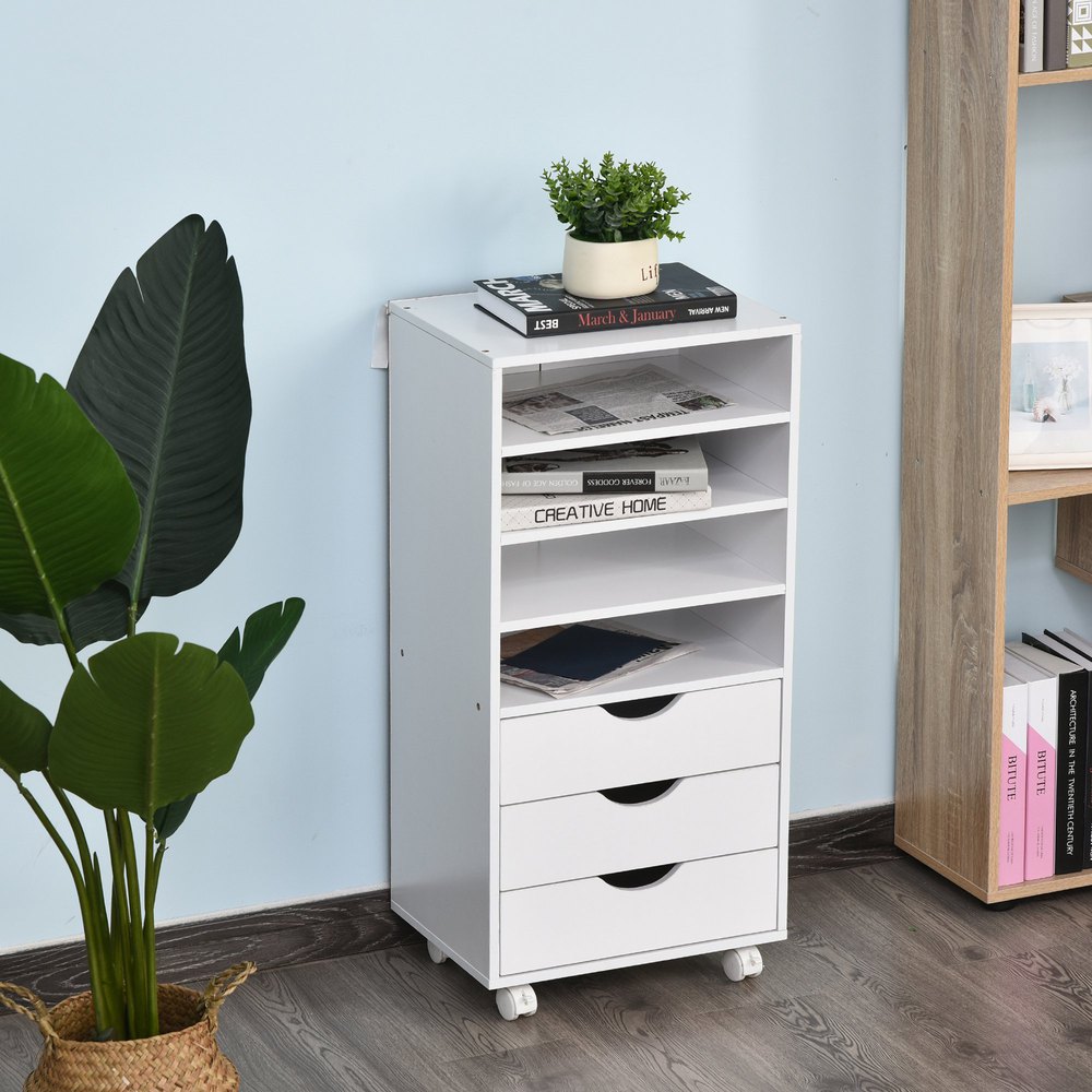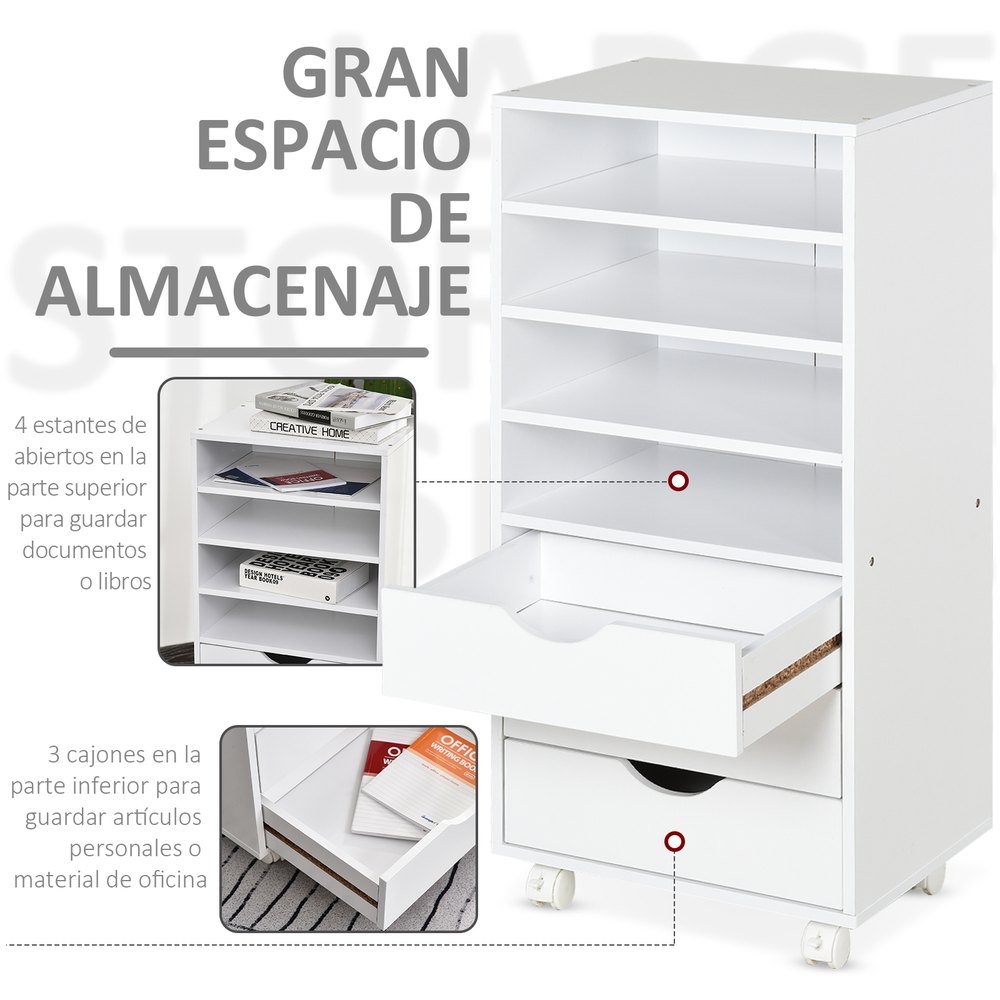 Si quieres mantener tu zona de despacho en orden, este mueble auxiliar de oficina de Vinsetto te va a encantar.Podrás colocar en él todo el material de oficina, cuadernos, etc.que utilices o si lo prefieres lo puedes destinar como cajonera para manualidades y guardar en él todo el material que necesitas para tus creaciones.Este mueble auxiliar de oficina es perfecto tanto para utilizar en casa como en la oficina.No lo dudes y organiza los materiales de tu trabajo diario para no perder tiempo buscando la grapadora, los clips o tu bloc de notas que nunca sabes donde dejas.¡La opción perfecta para ganarle minutos al día!.Características:- El mueble auxiliar perfecto para mantener material de oficina bien organizado tanto en el despacho en casa como en la oficina.- Fabricado con tablero de partículas de grado E1.- Amplio espacio de almacenaje para diferentes tipos de objetos, desde papel a material de escritura o, pequeños aparatos de uso diario en el despacho:como grapadoras, clips, etc.- 4 ruedas perfectas para mover el mueble con comodidad.- Fácil de limpiar pasando un paño húmedo.- Requiere montaje.Especificaciones:- Color:blanco.- Material:tablero de partículas.- Medidas totales:40x30x83 cm (LxANxAL).- Medidas de cada estante abierto:37,5x30x9 cm (LxANxAL).- Medidas internas de cada cajón:35×23,5×7 cm.- Carga máxima:21 kg (total), 2,5 kg (cada estante).- Referencia:924-010.